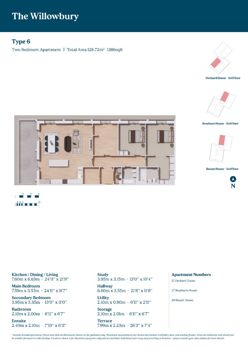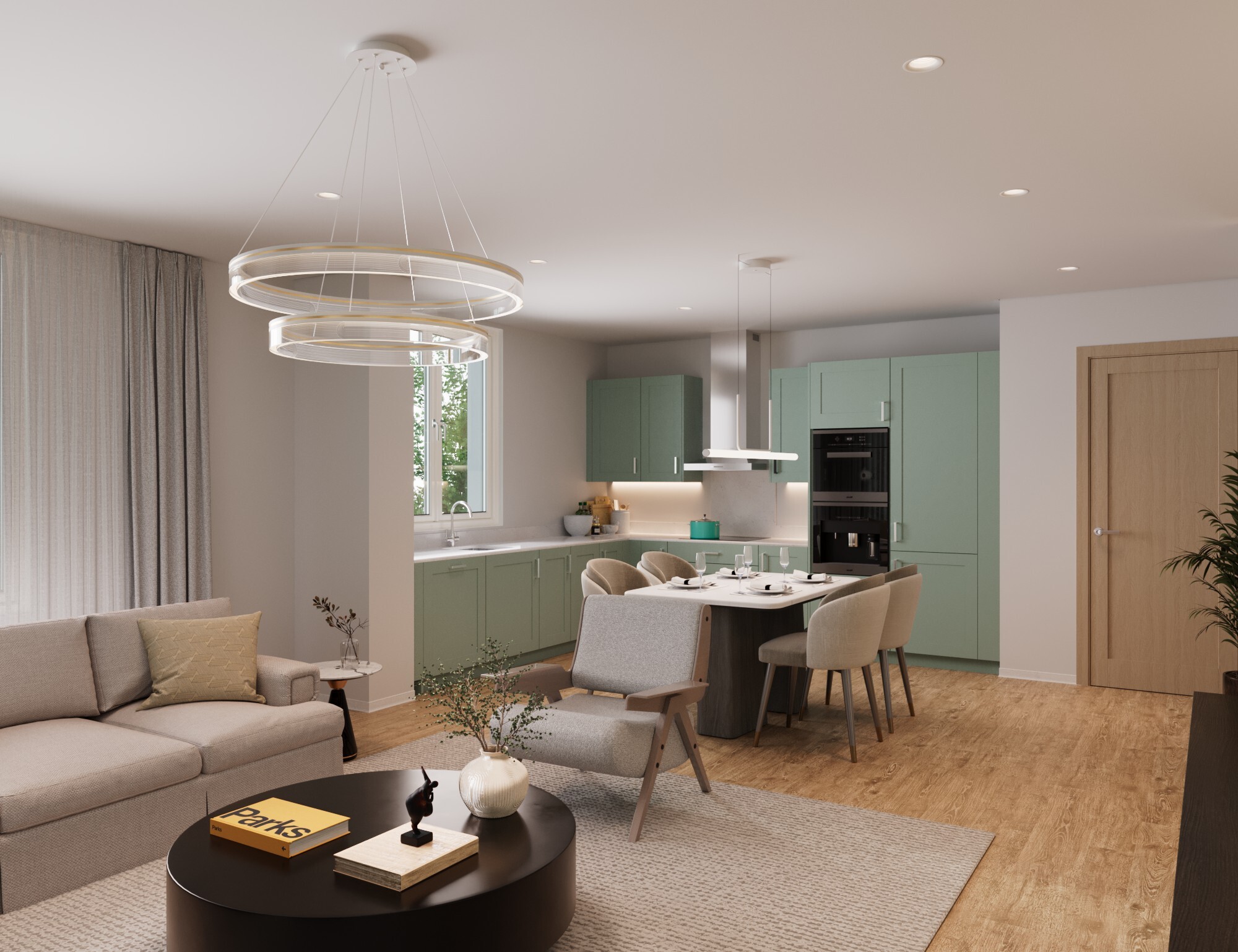 A contemporary two bedroom, two bathroom penthouse apartment on the third floor, offering open plan living with a central kitchen island and dual access to a separate study — ideal for flexible working or additional living space Upon entering, you are greeted with a spacious hallway that leads on to a well-lit and spacious living area adorned with large doors that allow an abundance of natural light. The open plan kitchen is designed with convenience in mind, equipped with Neff integrated appliances including an oven, microwave, hob, fridge freezer and an AEG dishwasher along with a separate utility cupboard housing a Neff washer/dryer and additional storage. The well-proportioned bedrooms offer a peaceful retreat, complete with built in wardrobes and generous windows. The ensuite bathroom features a walk-in shower.