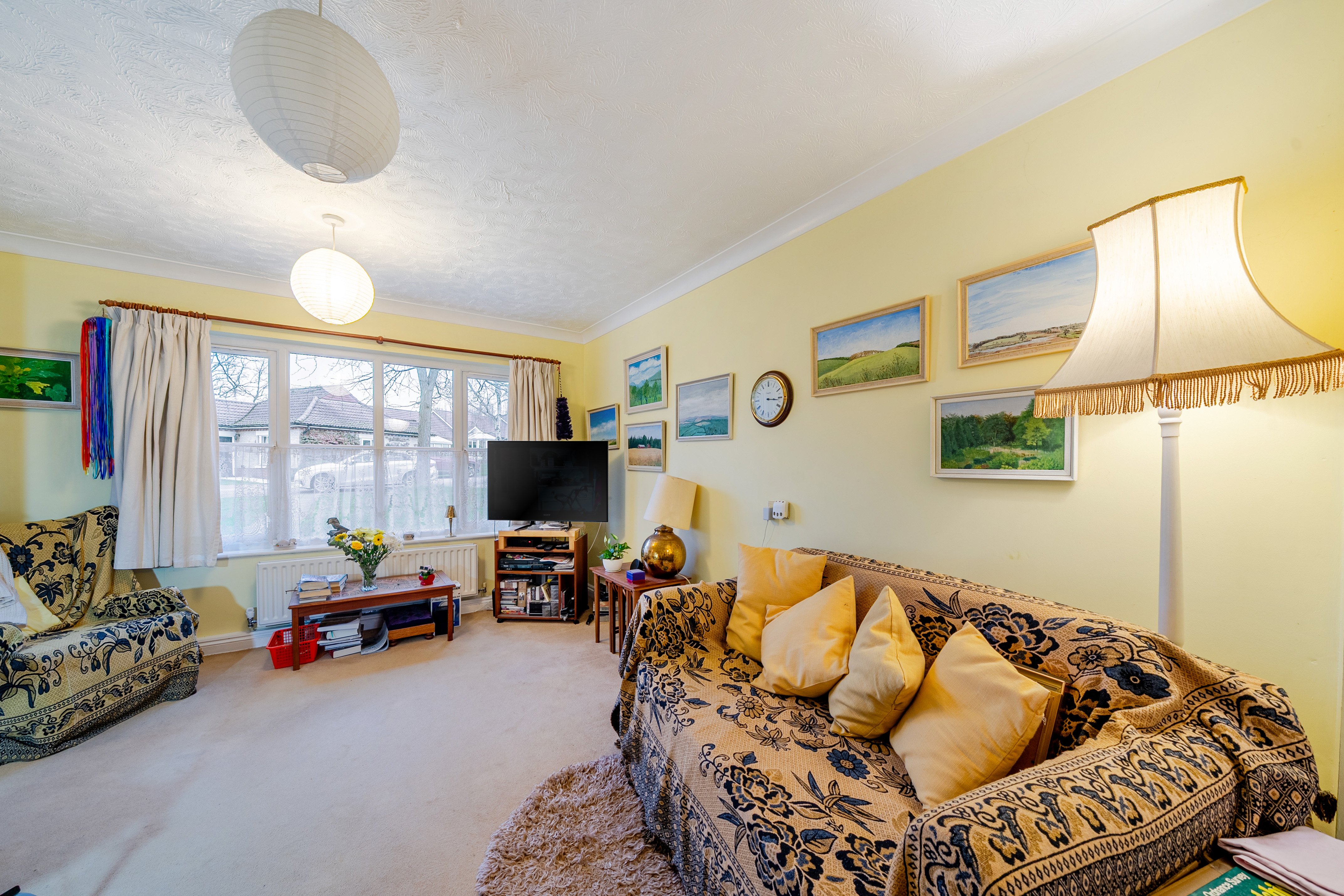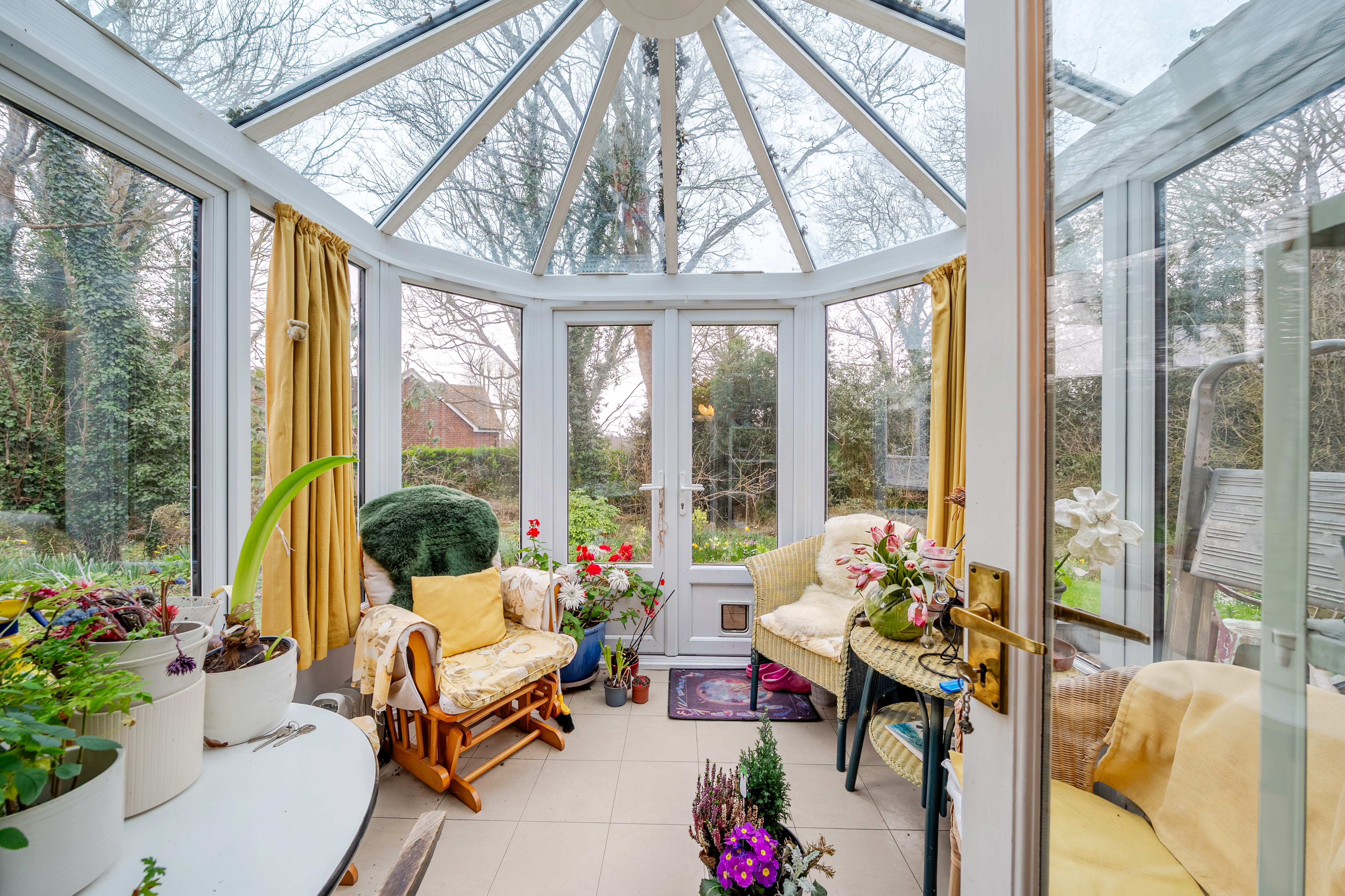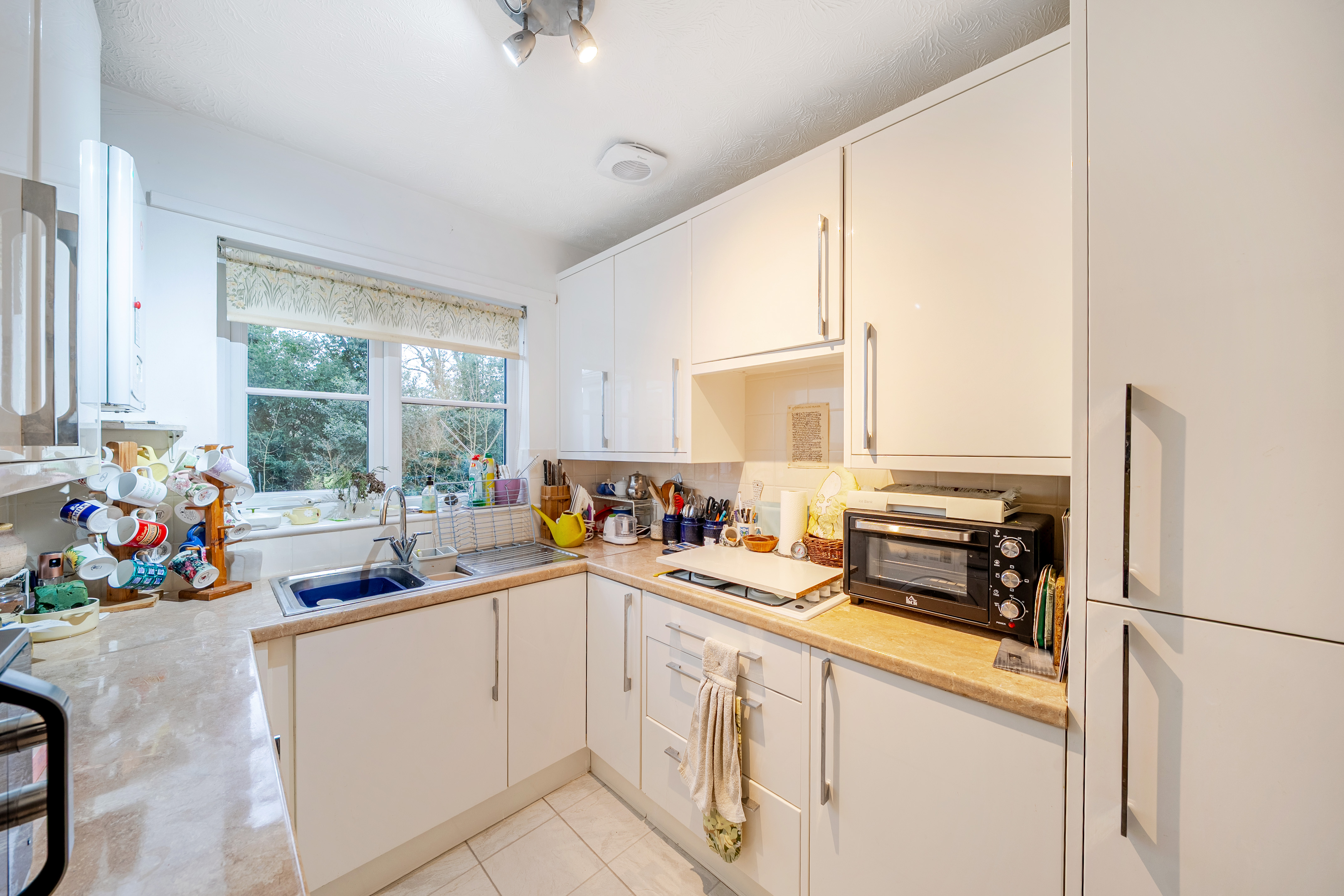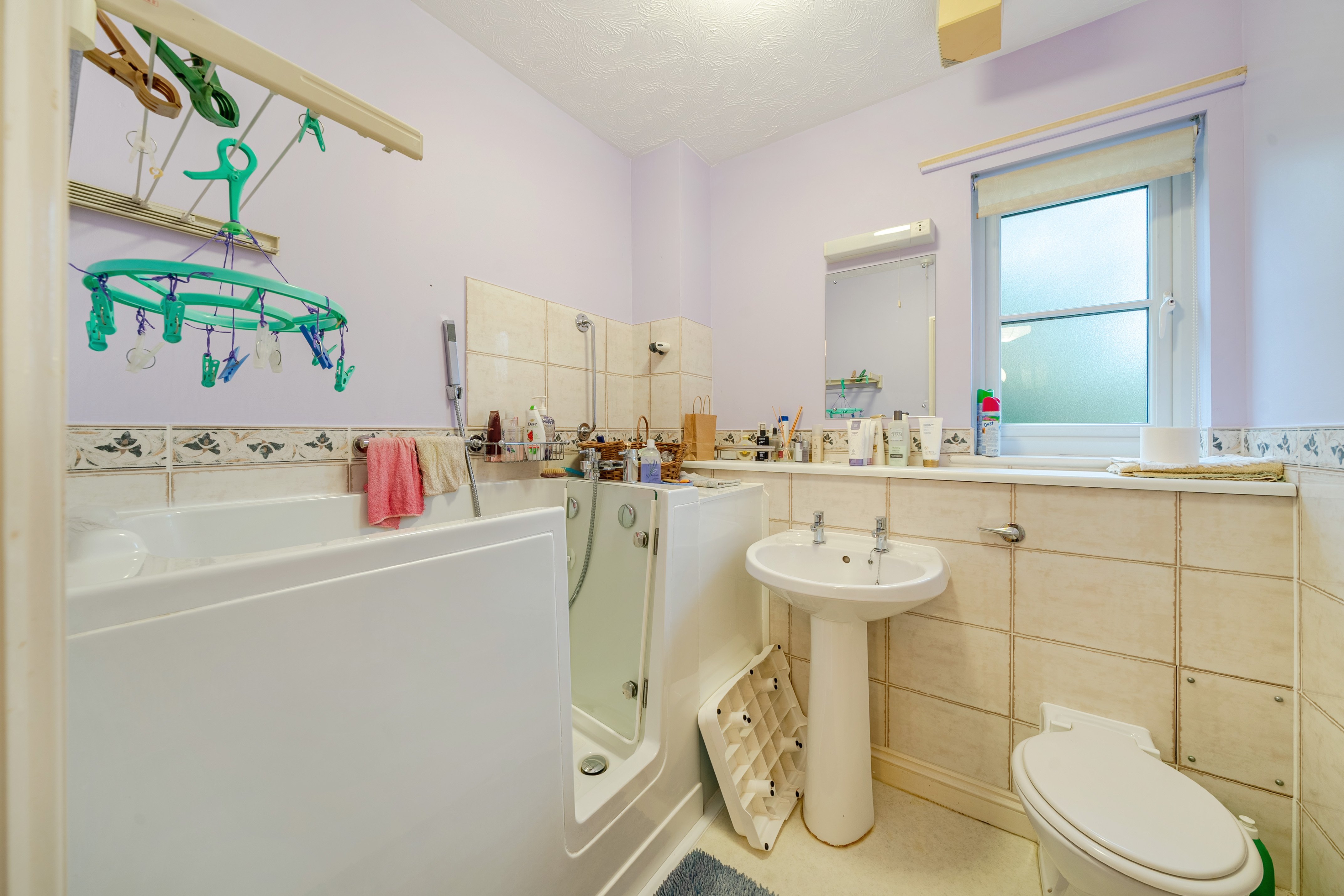The exterior features a bin store cupboard housing meters, with established plants and shrubs to the front. A private front door leads into the entrance hall, which includes a coat cupboard, airing cupboard, loft hatch, and wall-mounted call monitor system connected to 24-hour emergency assistance. Double doors open into the sitting room with a large front-aspect window overlooking the communal gardens, TV/FM and telephone points, and ceiling coving, leading through an archway to the dining room. The dining room has double French doors to the conservatory and access to the kitchen, which is fitted with white gloss wall and base units, roll-top work surfaces with a stainless-steel sink, four-ring ceramic hob, washing machine, wall-mounted boiler, and a rear-aspect window overlooking the communal grounds. The master bedroom enjoys a rear-aspect view of the grounds, with a built-in double wardrobe and en-suite shower room comprising an enclosed shower cubicle, WC, and vanity sink unit. Bedroom two has a front-aspect window and built-in cupboard. The bathroom includes a seated bath, WC, pedestal wash hand basin, and frosted window. The conservatory features a tiled floor and double doors opening onto a patio area within the communal gardens.