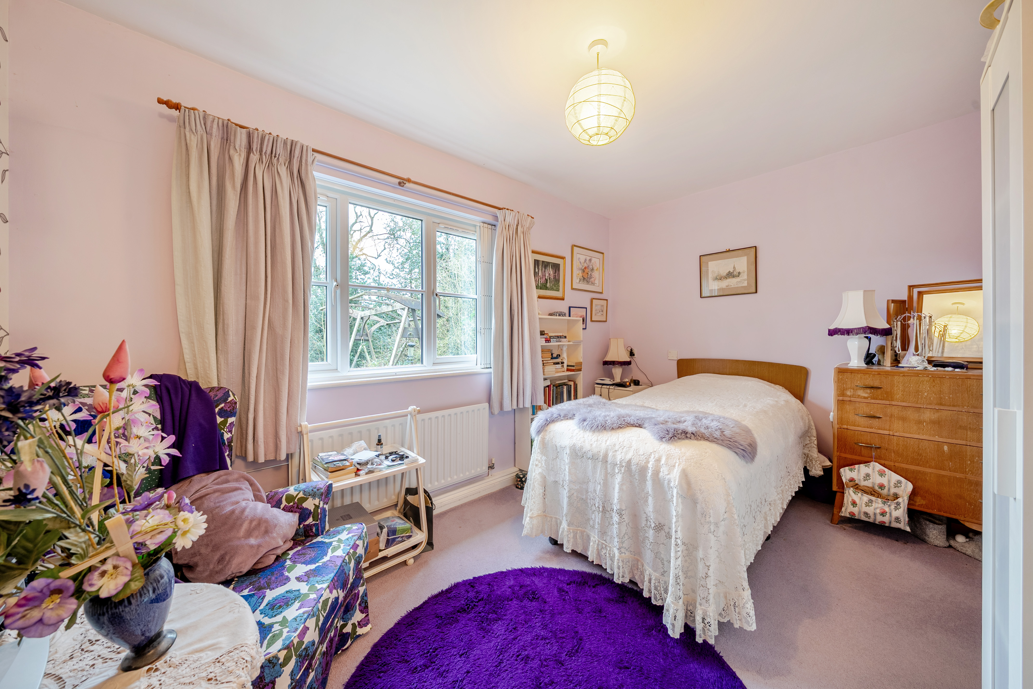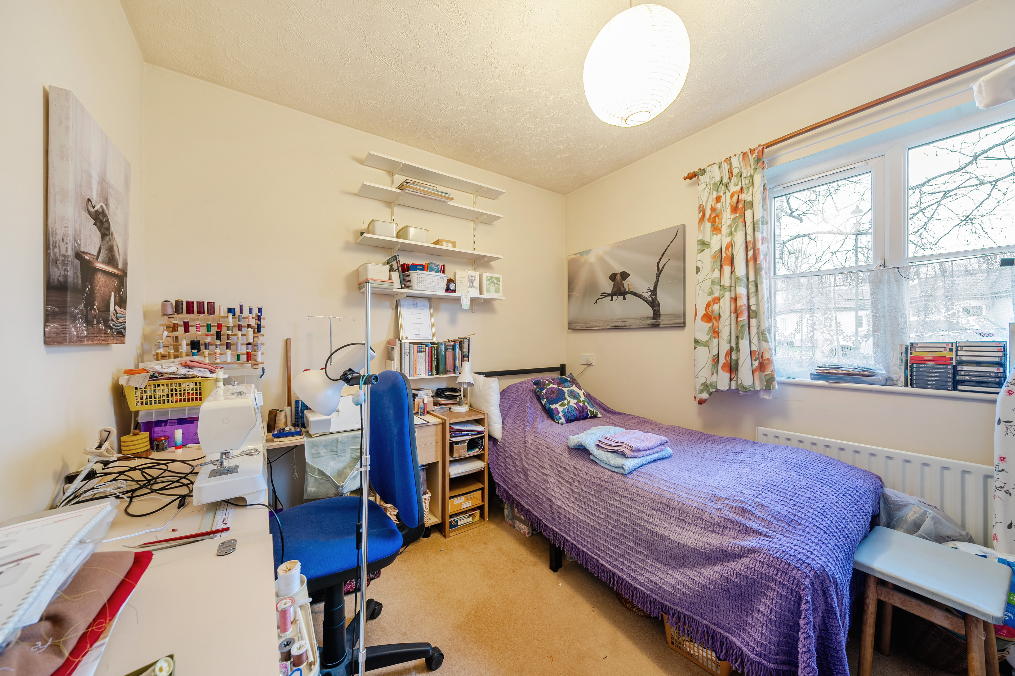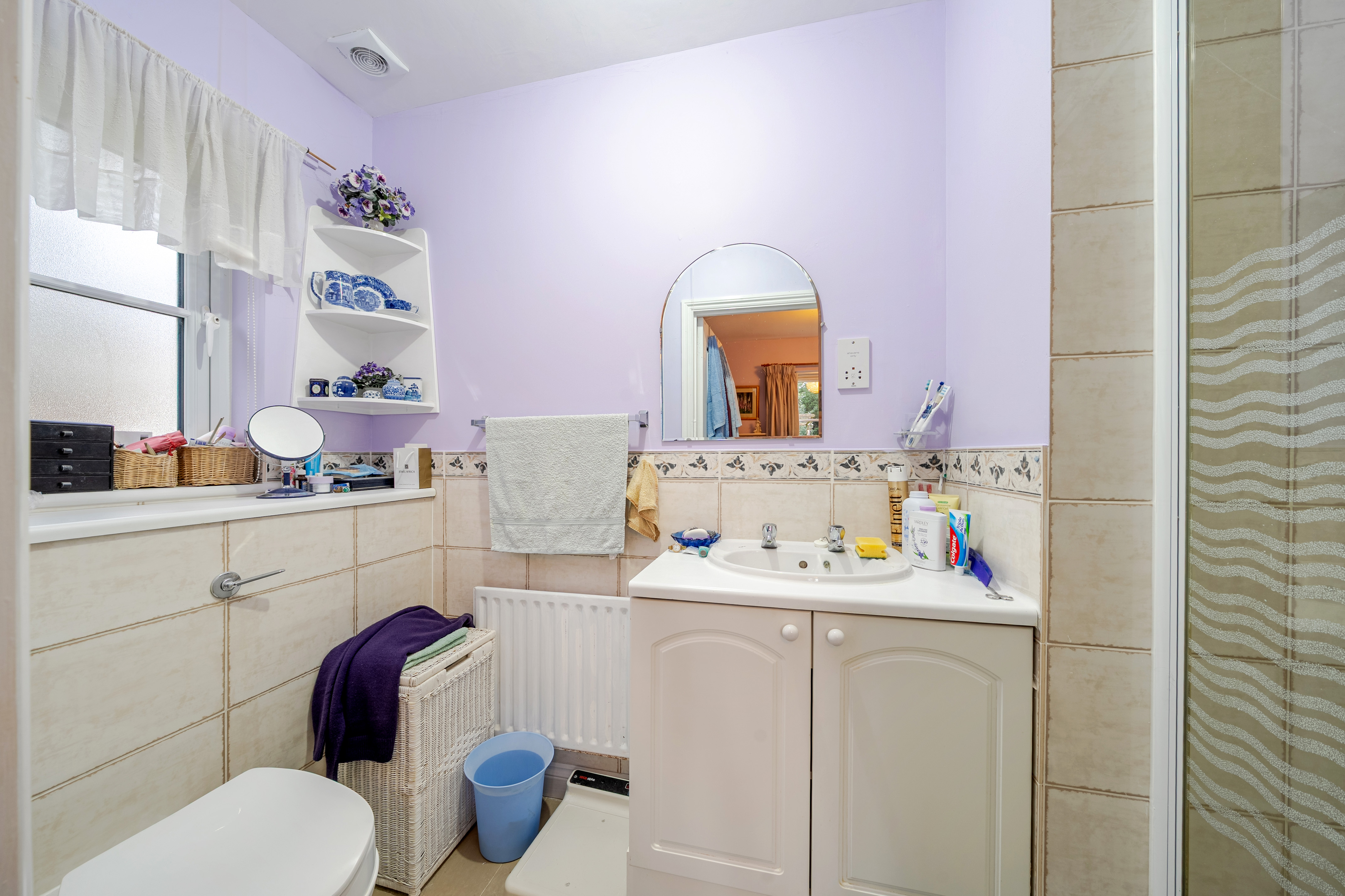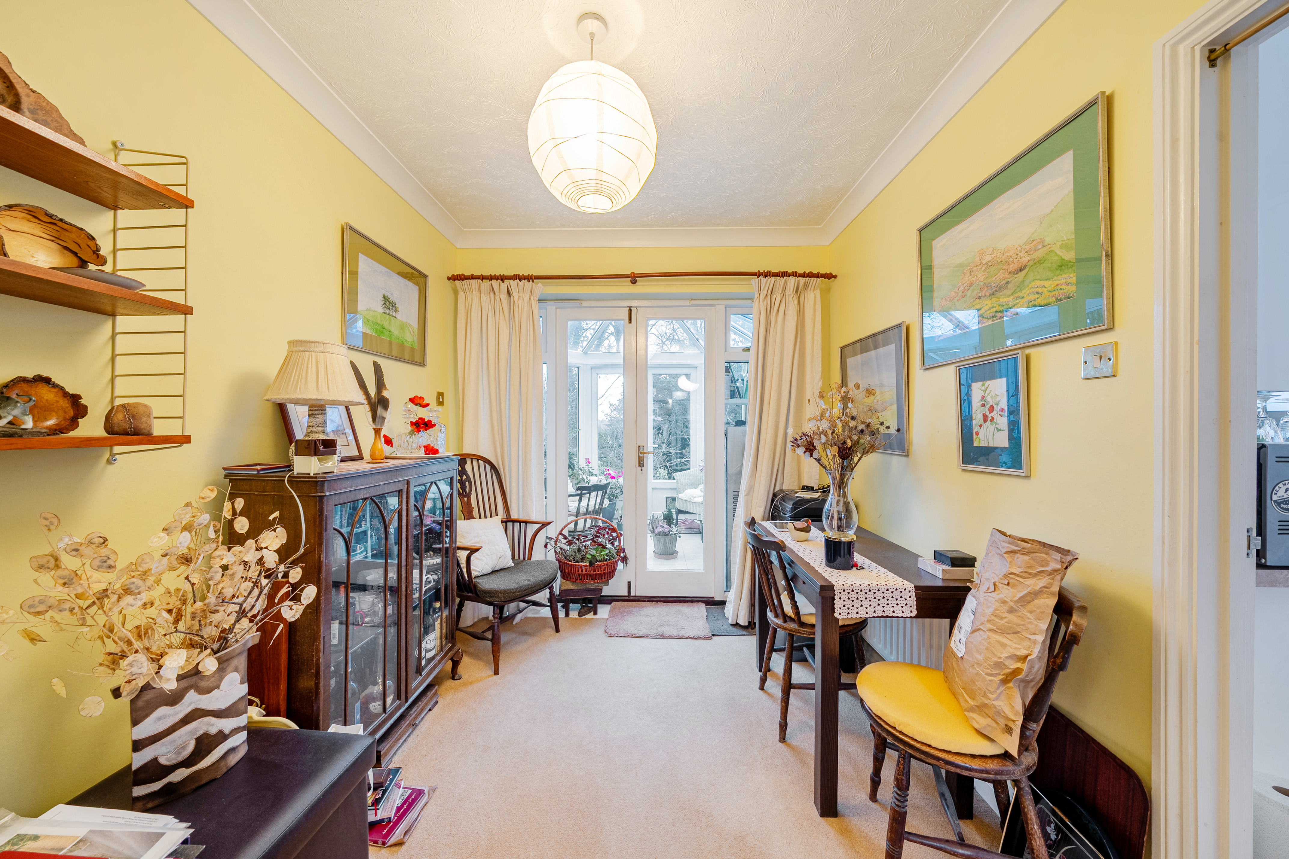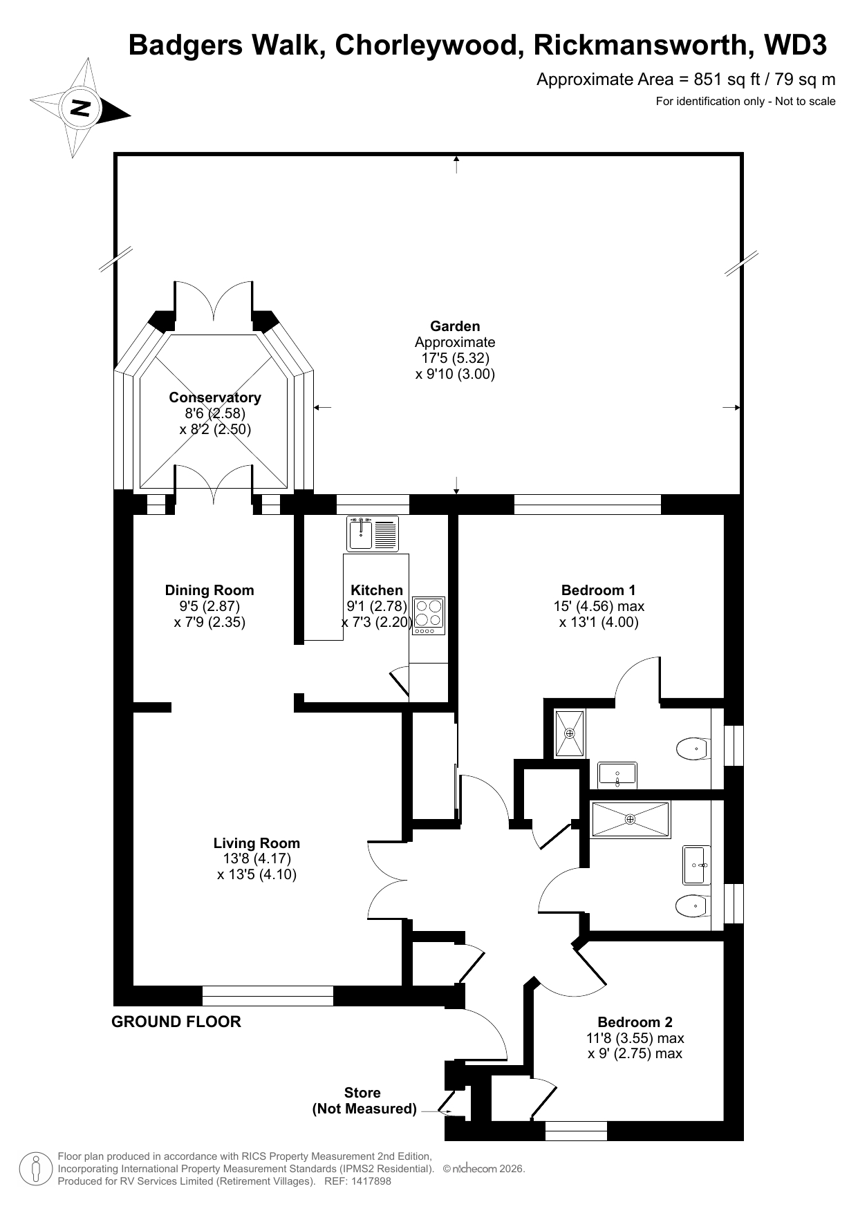 The exterior features a bin store cupboard housing meters, with established plants and shrubs to the front. A private front door leads into the entrance hall, which includes a coat cupboard, airing cupboard, loft hatch, and wall-mounted call monitor system connected to 24-hour emergency assistance. Double doors open into the sitting room with a large front-aspect window overlooking the communal gardens, TV/FM and telephone points, and ceiling coving, leading through an archway to the dining room. The dining room has double French doors to the conservatory and access to the kitchen, which is fitted with white gloss wall and base units, roll-top work surfaces with a stainless-steel sink, four-ring ceramic hob, washing machine, wall-mounted boiler, and a rear-aspect window overlooking the communal grounds. The master bedroom enjoys a rear-aspect view of the grounds, with a built-in double wardrobe and en-suite shower room comprising an enclosed shower cubicle, WC, and vanity sink unit. Bedroom two has a front-aspect window and built-in cupboard. The bathroom includes a seated bath, WC, pedestal wash hand basin, and frosted window. The conservatory features a tiled floor and double doors opening onto a patio area within the communal gardens.