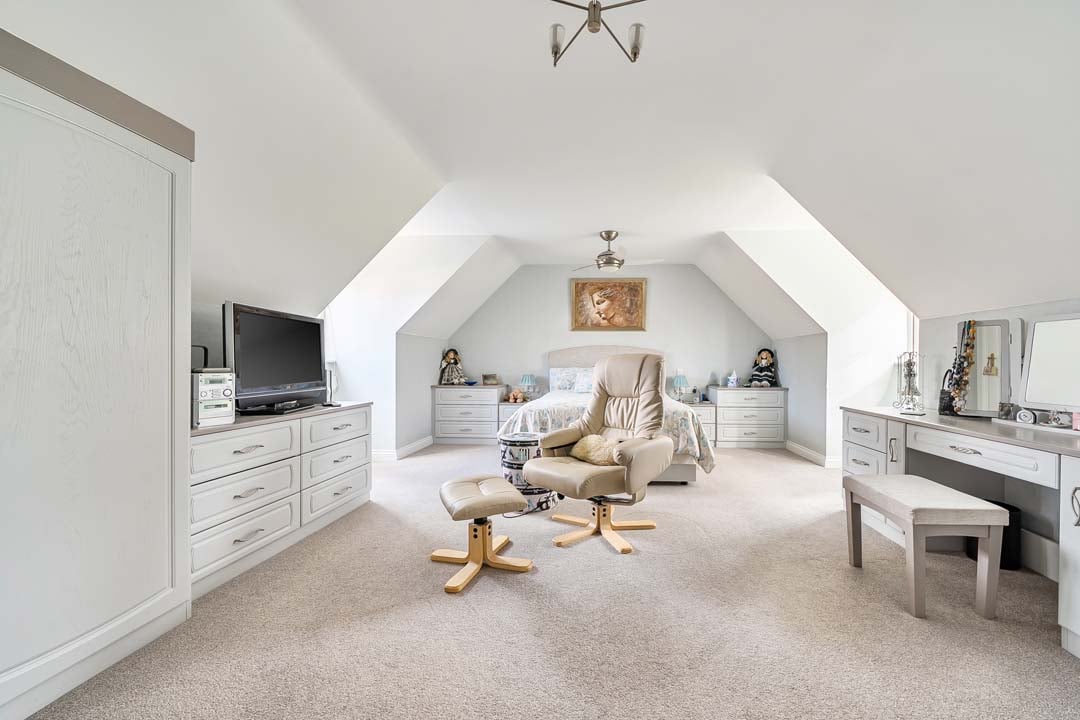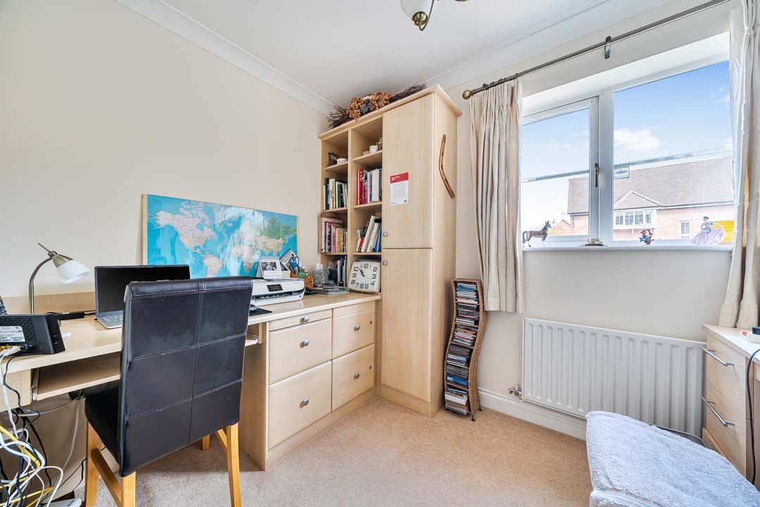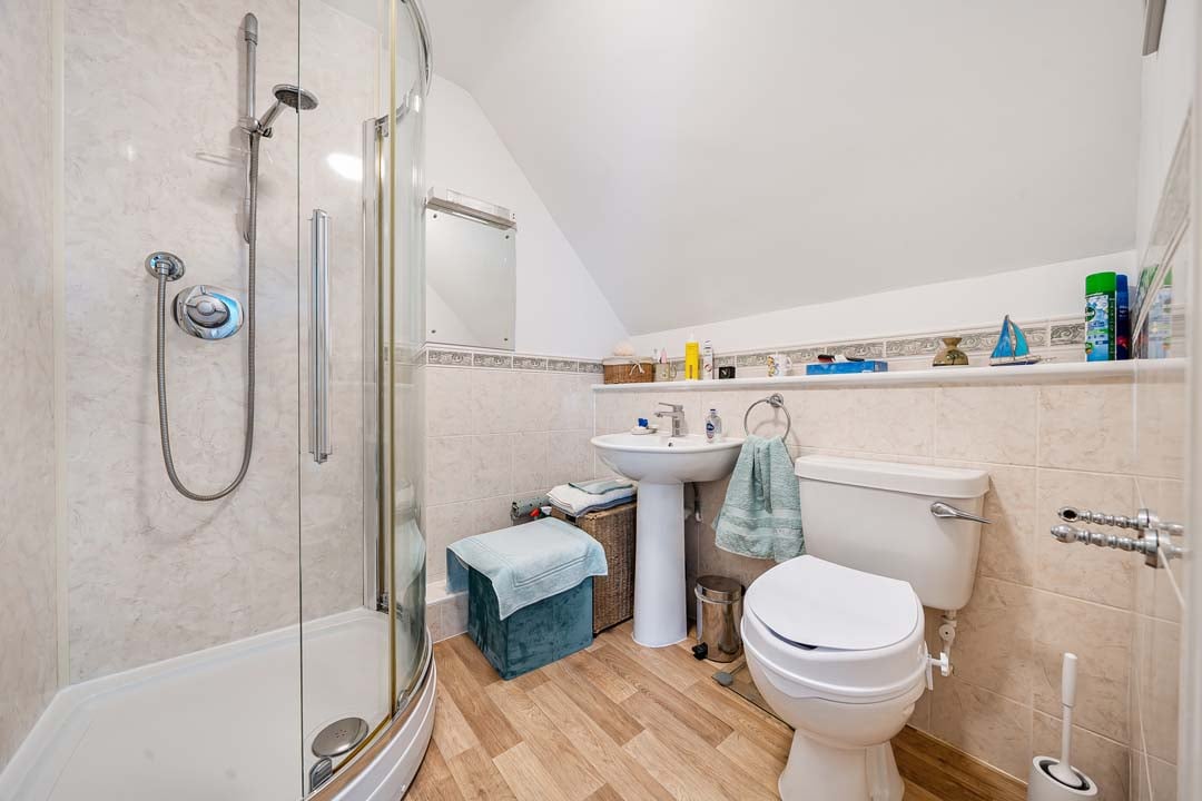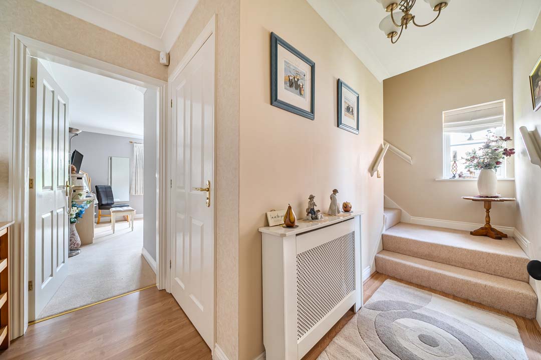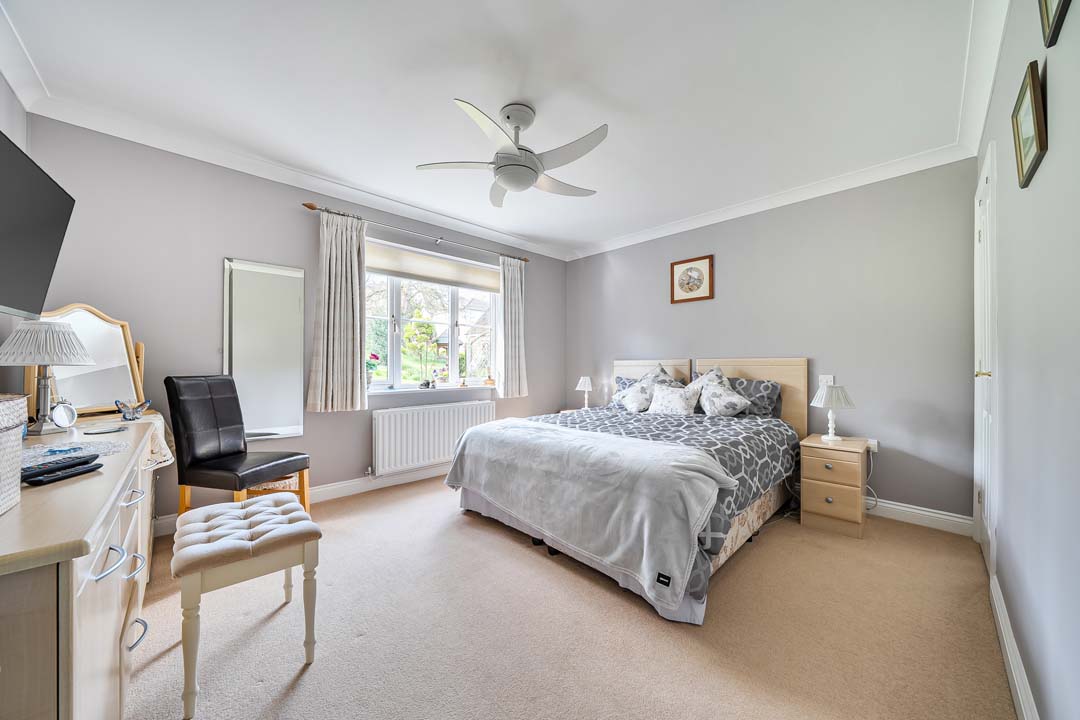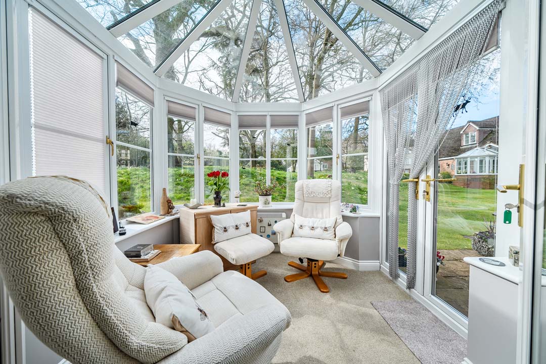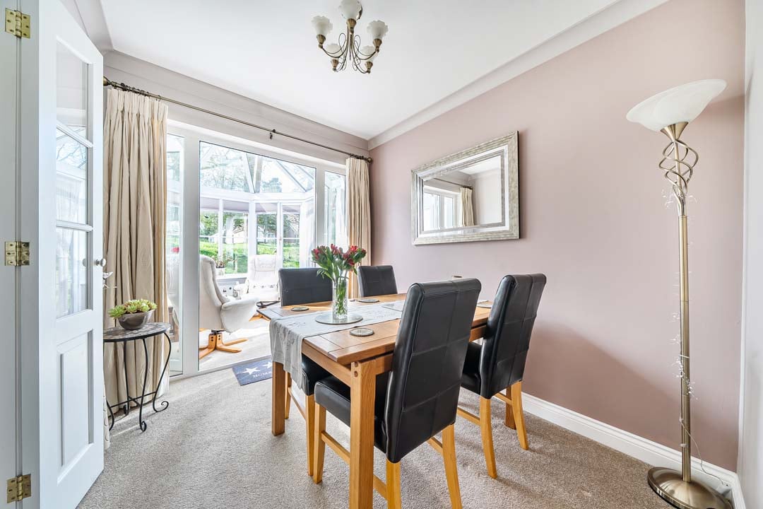 A generous sized dormer bungalow in beautiful surroundings with South facing conservatory, boasting a backdrop of mature trees and seasonal planting leading to the Woodland walk. This property is updated and offers a small study off the entrance hall, a spacious downstairs bedroom, and full bathroom. Glazed doors leading into the lounge/dining space and further out to the conservatory. The kitchen is modern, and fully fitted. Upstairs in this property you will notice an abundance of storage in the cupboards and closet for the water tank allowing easy indoor clothes drying. Enter the generous principal bedroom with it's ensuite shower room, and built in double wardrobe space. Double aspect windows draw in the light, and offers pretty views.