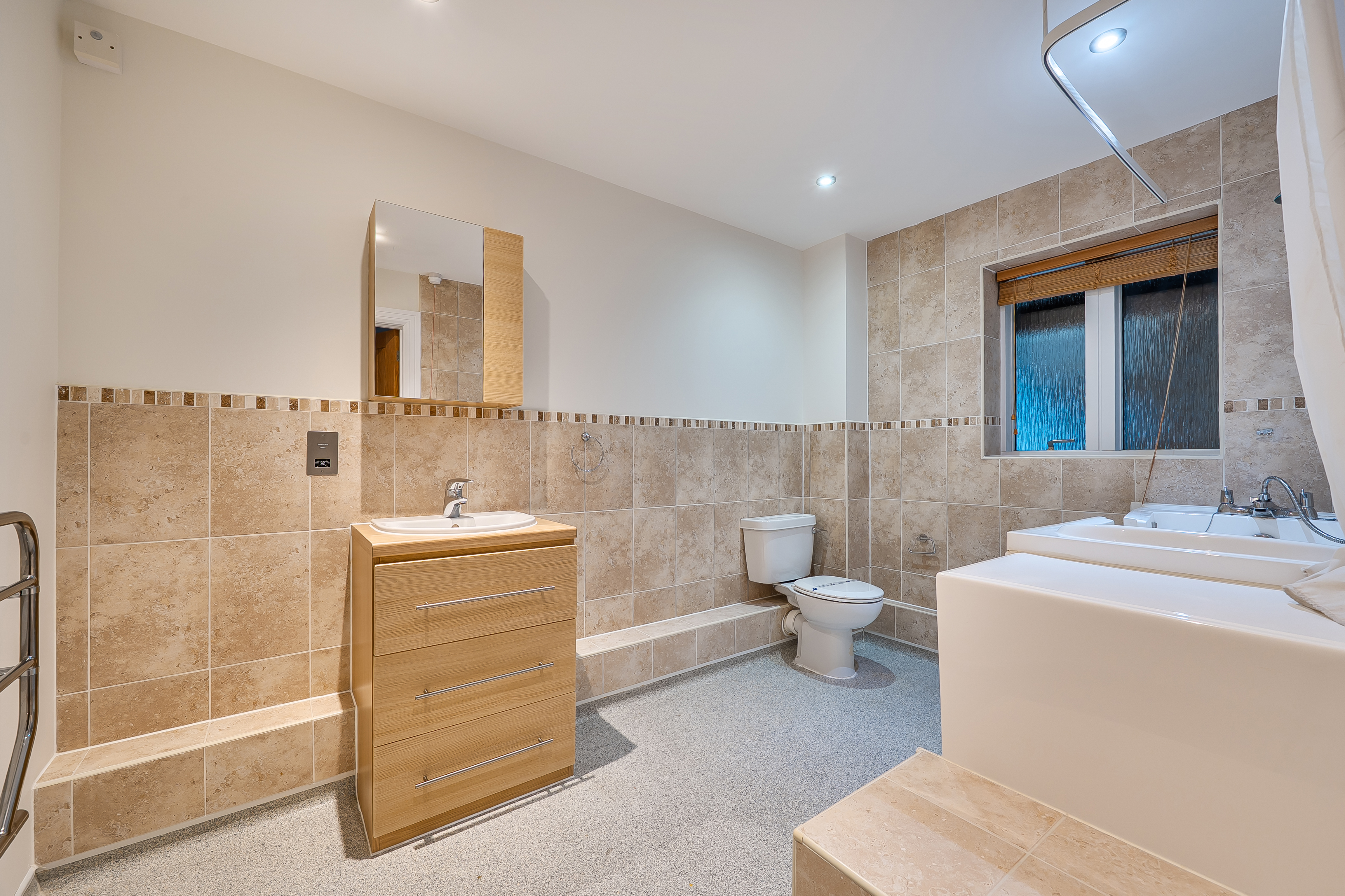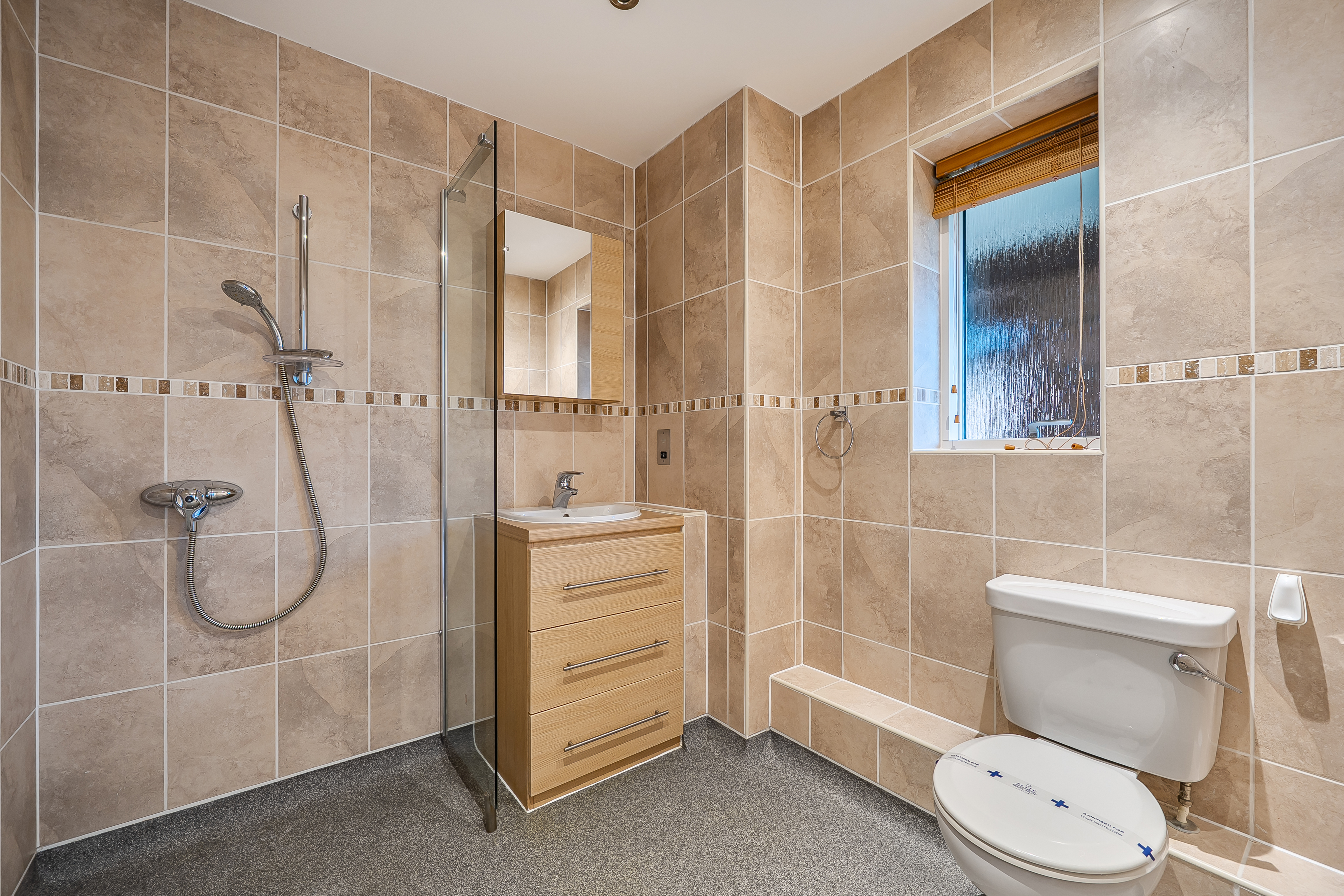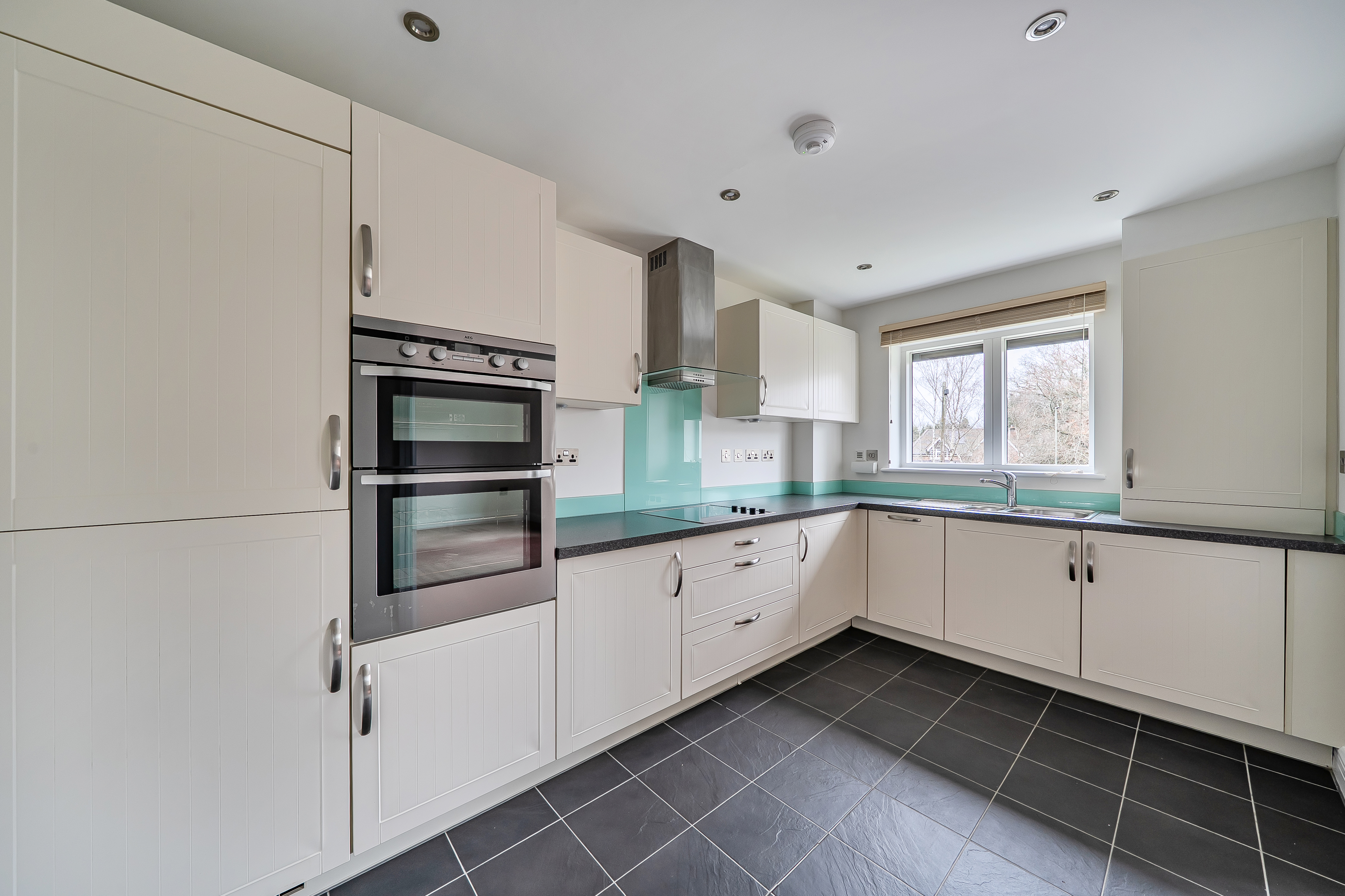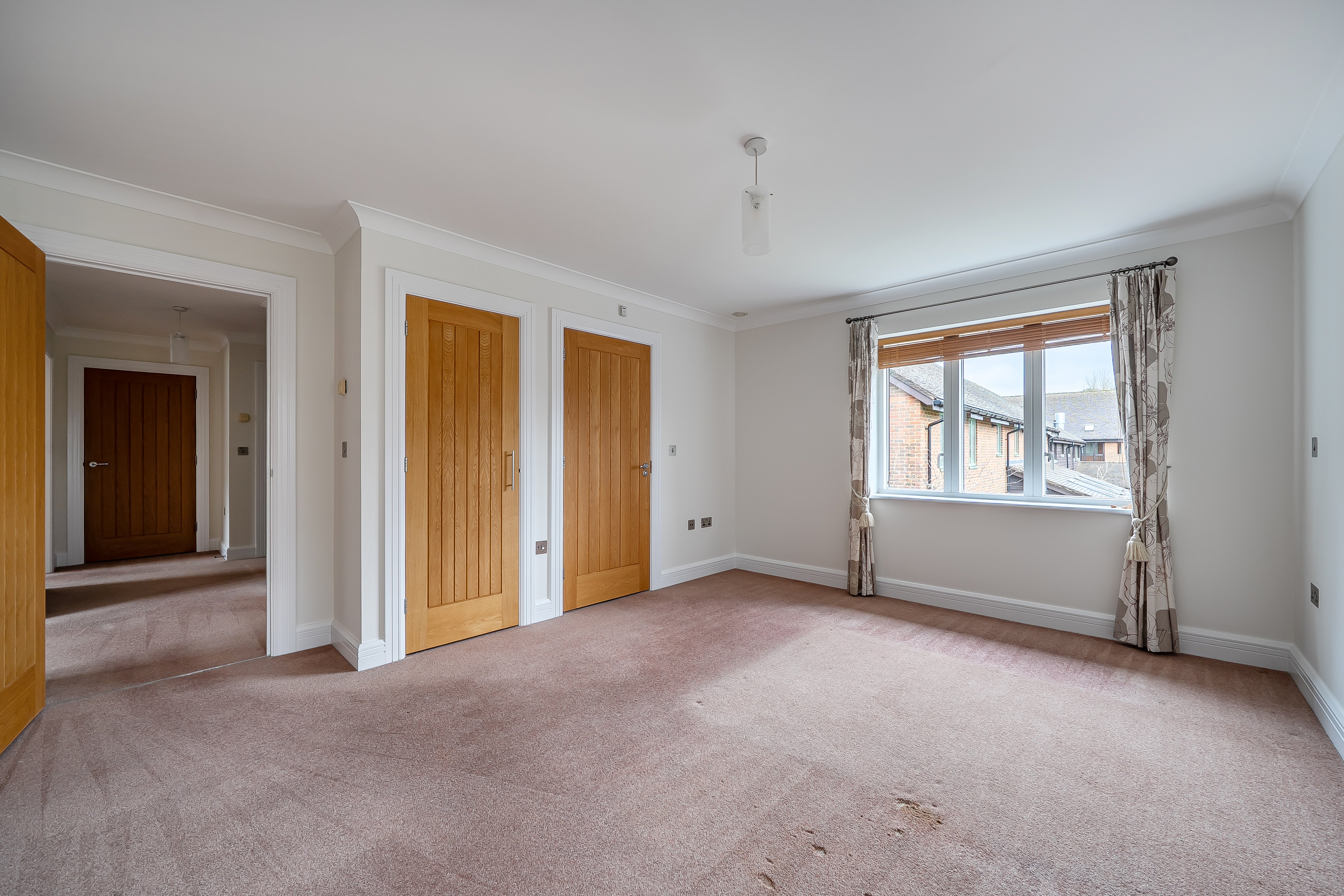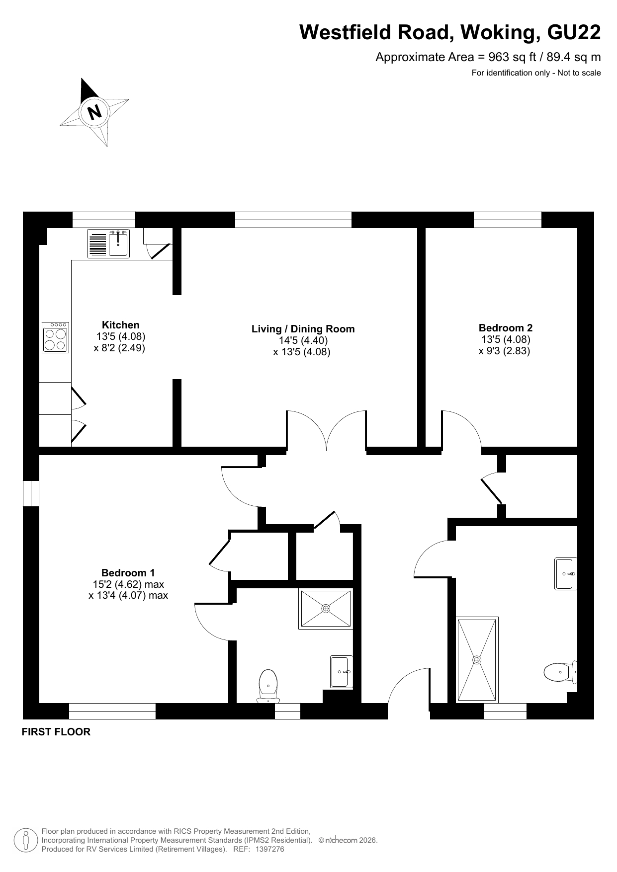 A spacious two-bedroom first-floor apartment set within the popular Mayford Grange Retirement Village. The accommodation is presented in good order throughout and comprises: a spacious hallway with storage cupboards; a sitting/dining room with an arch opening into a large modern kitchen with integrated eye-level electric oven, electric hob, dishwasher, washer-dryer, and fridge/freezer; a master bedroom with views across the gardens, a fitted wardrobe, and an en-suite wet room; a second double bedroom; and a bathroom with an accessible bath, WC, and wash hand basin.