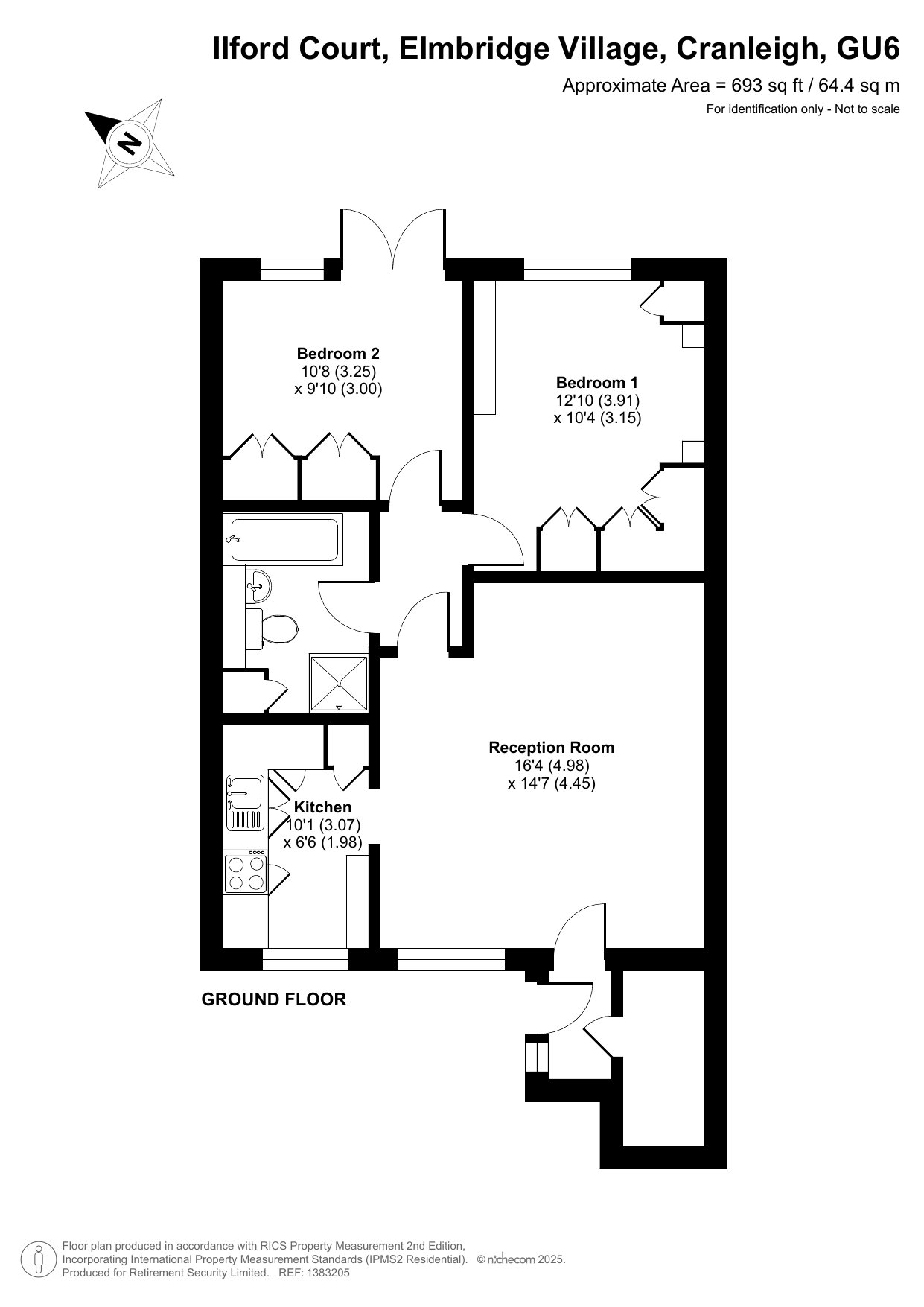 Newly decorated throughout, this well-presented ground-floor two-bedroom apartment offers bright and comfortable living in an attractive setting. The front door opens into a inner hallway with a generous under-stairs storage cupboard, leading through to the living/dining room. Adjacent is a fully fitted kitchen, complete with an eye-level double oven and integrated fridge-freezer. The main double bedroom benefits from ample fitted wardrobes and pleasant views over the gardens, while the second bedroom provides additional built-in storage and features double doors opening onto a delightful private patio, with the allotments and landscaped grounds beyond. The bathroom is well equipped with a bath, WC, wash hand basin, and a separate shower for added convenience. Elmbridge is a well-established village with 276 homes, including bungalows and apartments, set within in 27 acres of landscaped grounds. Located near the charming Cranleigh village, Elmbridge offers residents a range of amenities such as a restaurant, a lively bar, village hall, hair salon, croquet lawn, on-site store, library, and regular doctor's surgeries. Those with green fingers can enjoy our lively allotments, and there's a beautiful walking meadow and daily bus service for a well-rounded lifestyle.